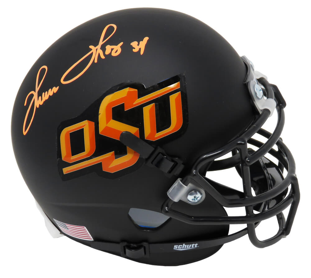 Thurman Thomas signed Oklahoma State Cowboys black Schutt mini helmet. Item comes with a Schwartz Sports Memorabilia tamper-proof numbered hologram and Certificate of Authenticity which can be verified online.