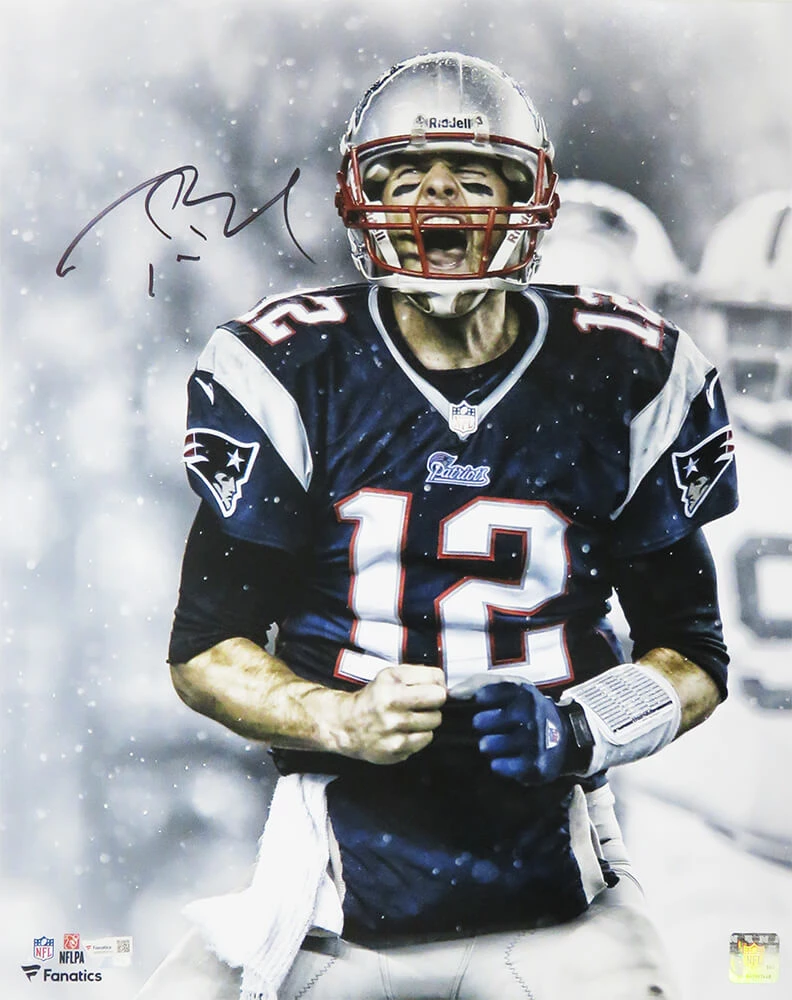 Tom Brady signed New England Patriots snow game screaming 16×20 photo. Item comes with a Fanatics Authentic tamper-proof numbered hologram and Certificate of Authenticity which can be verified online.