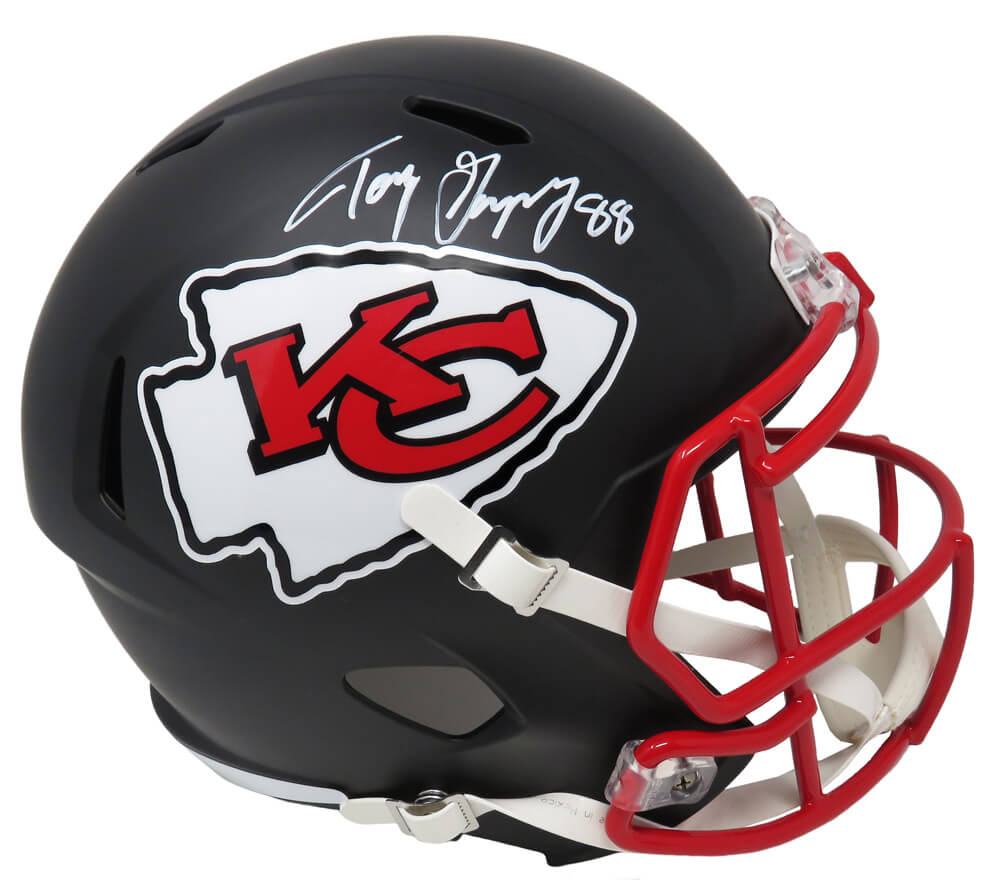 Tony Gonzalez signed Kansas City Chiefs flat black matte Riddell full size replica speed helmet. Item comes with a Schwartz Sports Memorabilia tamper-proof numbered hologram and Certificate of Authenticity which can be verified online.