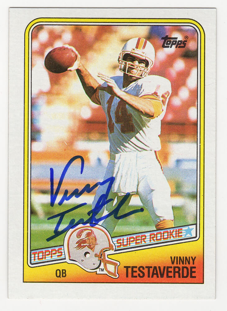 Vinny Testaverde signed Tampa Bay Buccaneers 1988 Topps football rookie card #352. Item comes with a Schwartz Sports Memorabilia tamper-proof numbered hologram (on back of physical card) and Certificate of Authenticity which can be verified online.