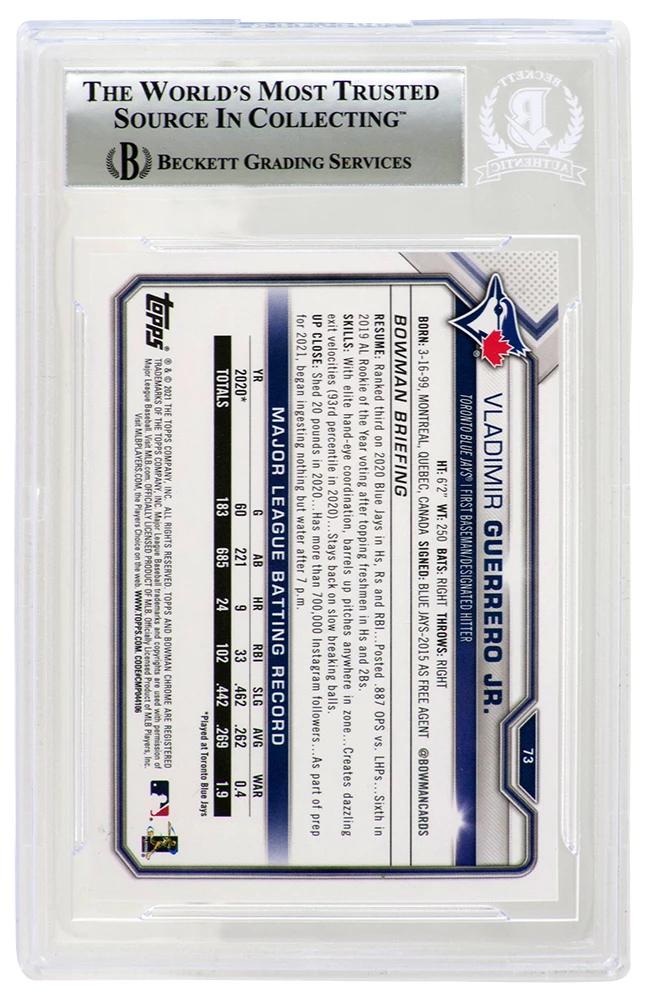 Vladimir Guerrero Jr. signed Toronto Blue Jays 2021 Bowman baseball trading card #73. The card has been authenticated and encapsulated by Beckett Authentic and the authentication number can be verified online. The image of the item is a stock photo, as we may have multiples of the item in stock. The Slabbed Card you will receive will be of the card described. (Same grade, Same authentication) You may or may not receive the exact Beckett serial number on the slab label shown in image.