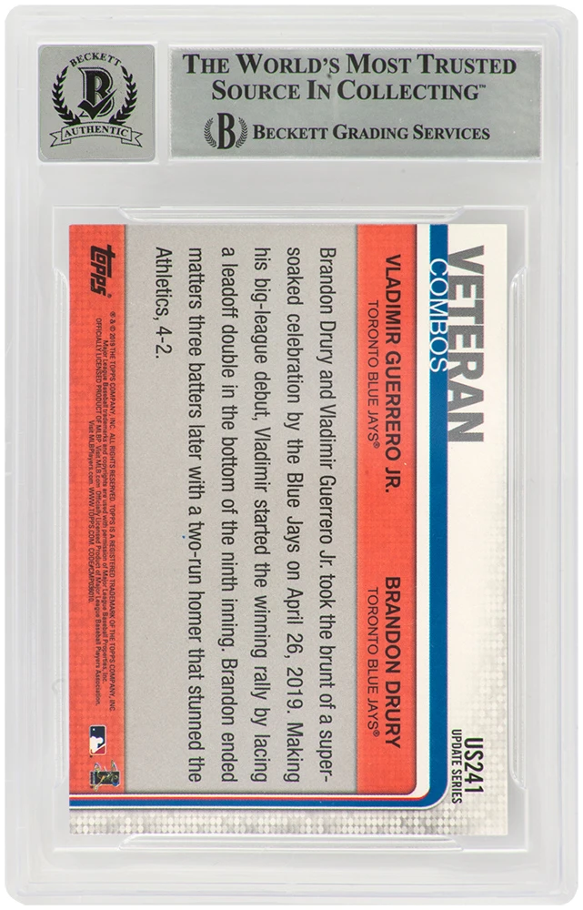 Vladimir Guerrero Jr signed Toronto Blue Jays 2019 Topps Update rookie baseball trading card #US241. The card has been authenticated and encapsulated by Beckett Authentic and the autograph has been graded a Mint 10. The authentication number can be verified online. The image of the item is a stock photo, as we may have multiples of the item in stock. The Slabbed Card you will receive will be of the card described. (Same grade, Same authentication) You may or may not receive the exact Beckett serial number on the slab label shown in image.