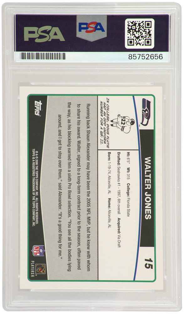 Walter Jones signed Seattle Seahawks 2006 Topps football trading card #15. The card has been authenticated and encapsulated by PSA/DNA and the number can be verified online.