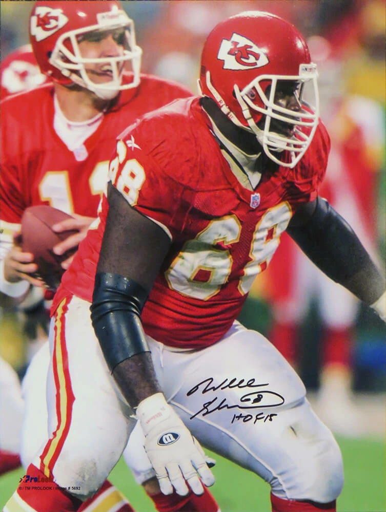 Will Shields signed Kansas City Chiefs action 16×20 photo with ‘HOF 15’ inscription. Item comes with a Schwartz Sports Memorabilia tamper-proof numbered hologram and Certificate of Authenticity which can be verified online.