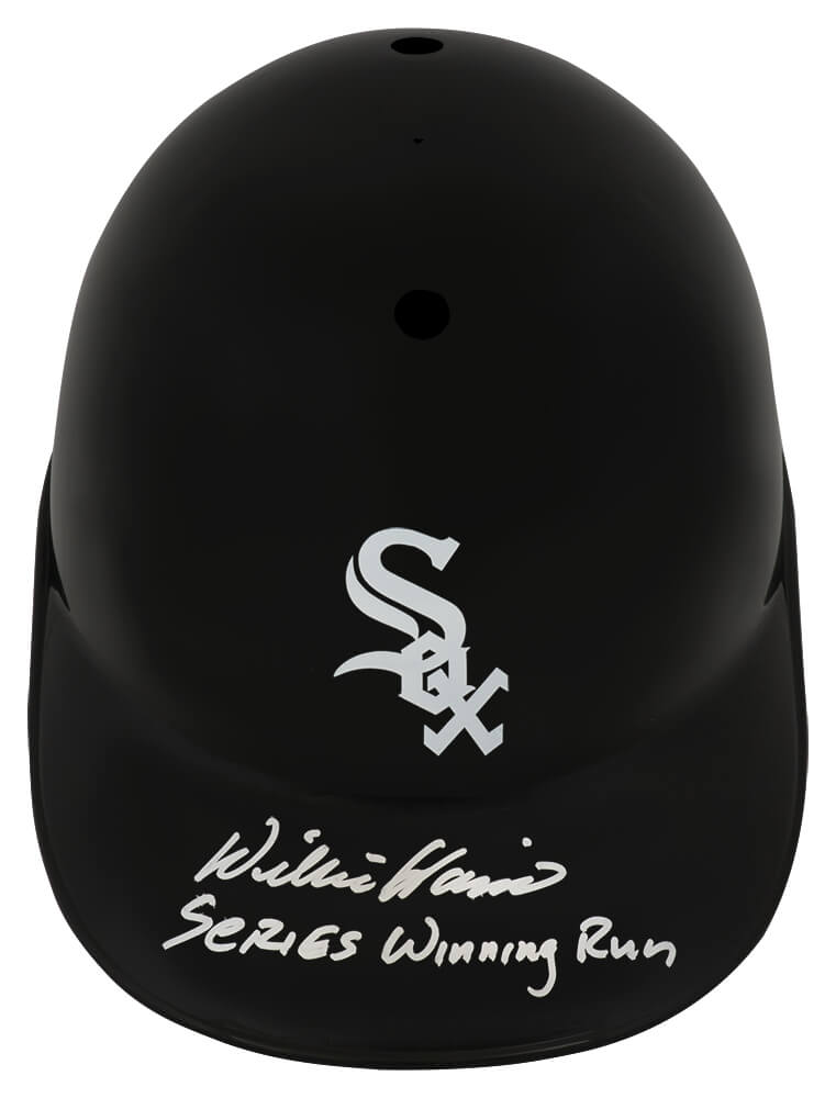Willie Harris signed Chicago White Sox souvenir replica batting helmet with ‘Series Winning Run’ inscription. Item comes with a Schwartz Sports Memorabilia tamper-proof numbered hologram and Certificate of Authenticity which can be verified online.