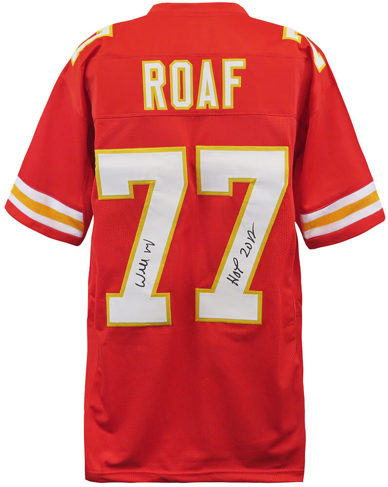 Willie Roaf signed red throwback custom football jersey with ‘HOF 2012’ inscription. Item comes with a Schwartz Sports Memorabilia tamper-proof numbered hologram and Certificate of Authenticity which can be verified online.