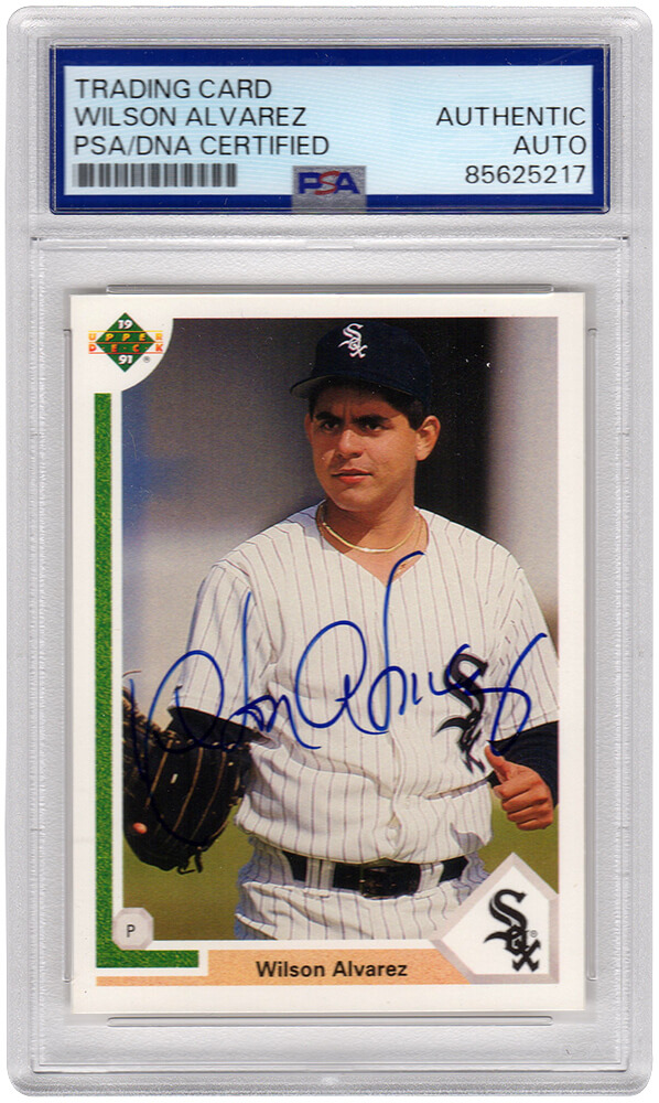 Wilson Alvarez signed White Sox baseball trading card (various cards). The card has been authenticated and encapsulated by PSA and the authentication number can be verified online.