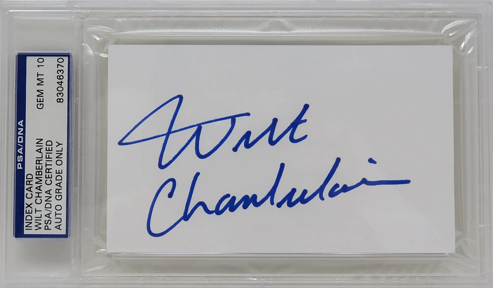 Wilt Chamberlain signed 3×5 white index card. The item has been encapsulated and given an autograph grade of 10 by PSA Authentication and contains an authentication number on the encapsulation label that can be verified online.
